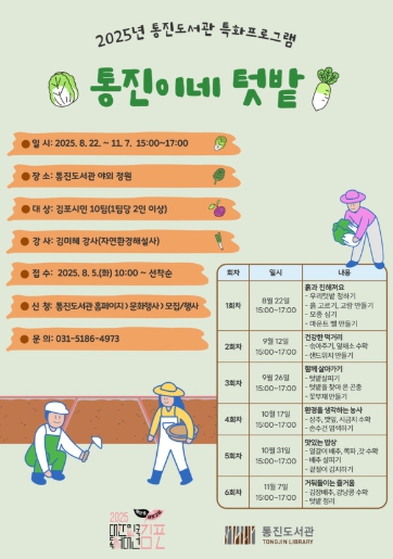 이번 프로그램은 통진도서관의 특화 주제인 농업과 생태·환경에 맞춘 것으로, 자연환경 해설사와 함께 도서관 야외정원에 있는 텃밭 상자에서 직접 텃밭을 가꿔보는 체험 활동이다.