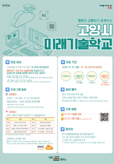 모집 대상은 고양시에 주소를 둔 만 18세~ 39세(1986년생~2007년생) 청년 20명으로, 클라우드 분야에 관심이 있고 취업 의지가 강한 지원자를 우선 선발한다. 교육비는 전액 무료이며, 월 출석률 80% 이상 시 소정의 훈련 수당도 지급된다.
