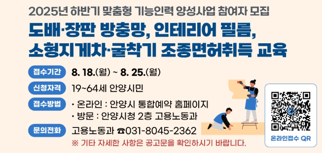 접수는 안양시청 본관 2층 고용노동과 일자리지원팀을 방문하거나 안양시 통합예약 홈페이지의 ‘일자리 프로그램’란을 통한 온라인 신청으로도 가능하다.