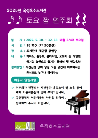 『토요 짬연주회』는 2023년부터 이어져 온 옥정호수도서관의 대표 문화사업으로, 도서관이 단순한 독서 공간을 넘어 시민들의 일상 속 문화예술 향유 거점으로 거듭나기 위한 일환으로 기획됐다.