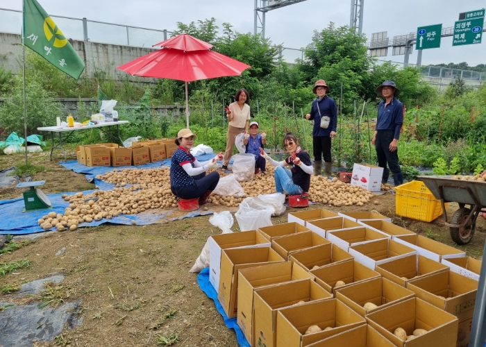 새마을회(지도자협의회‧부녀회)는 경기가 어려운 요즘 물가까지 올라 경제적 부담이 클 취약계층의 먹거리 고민을 덜어주고자 올헤 4월 마을 텃밭에 감자를 심고, 2달간 감자를 키워 지난 26일 수확했다.
