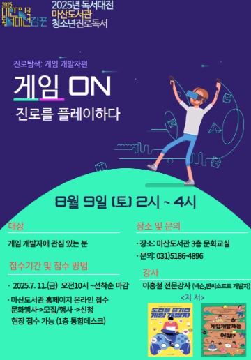 참여 신청은 7월 11일 10시부터 마산도서관 홈페이지의 ‘문화행사 신청(모집/행사)’에서 하거나 현장 접수를 통해 가능하다. 모집인원은 게임개발자에 관심 있는 청소년을 포함한 일반 시민 20명이다.