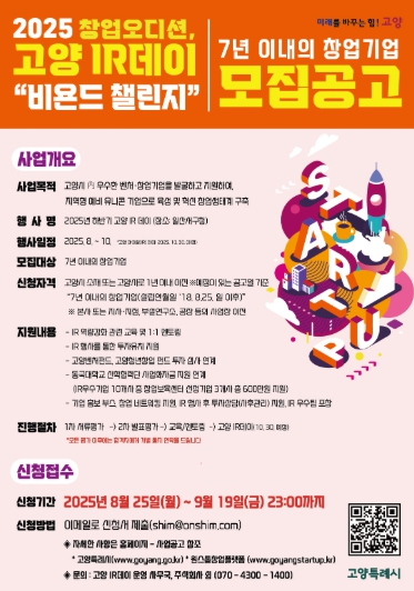 또한 최종 선정된 10개사는 10월 30일 일산서구청에서 개최 예정인‘2025 창업오디션, 고양아이알(IR)데이 비욘드 챌린지’에 참가할 수 있는 자격이 주어진다. 액셀러레이터(AC)와 벤처캐피탈(VC)과의 투자유치 및 심사, 아이템 검증, 네트워킹 등에 참여할 수 있다.
