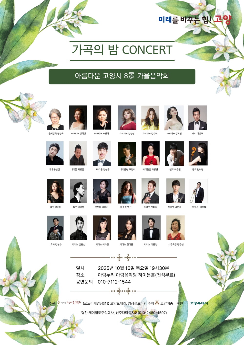 고양특례시가 후원하는 ‘2025 가곡의 밤 – 아름다운 고양시 8경 가을 음악회’가 고양아람누리 아람음악당에서 개최된다.