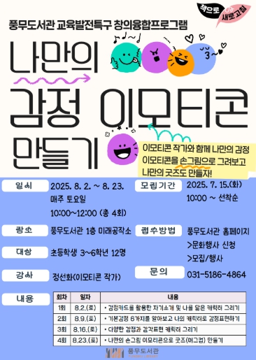강의 신청은 7월 15일 오전 10시부터 풍무도서관 홈페이지를 통해 가능하며, 초등학교 3~6학년을 대상으로 선착순 12명을 모집한다.
