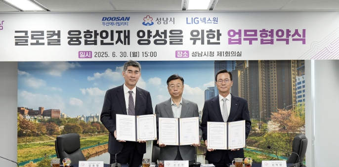 시는 6월 30일 오후 3시 시청 4층 제1회의실에서 신상진 성남시장과 김동철 두산에너빌리티 부사장, 신익현 LIG넥스원 대표이사 등이 참석한 가운데 ‘글로컬 융합 인재 양성을 위한 업무 협약’을 체결했다.