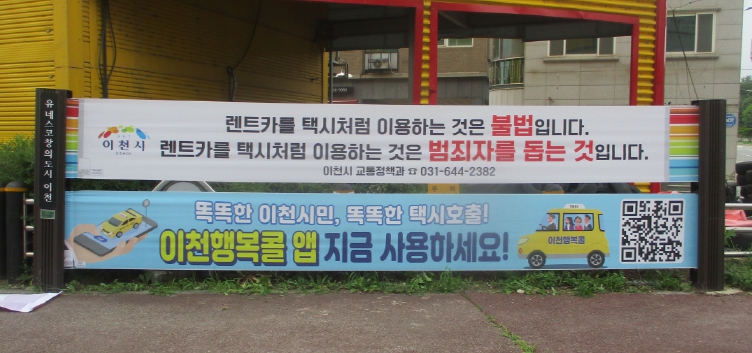 이천시는 2024년 접수된 불법 유상운송 신고(1,174건)에 대하여 수사 의뢰를 모두 마치고, 시민의 안전한 교통 이용을 유도하고 불법 유상운송 근절에 대한 인식을 높이기 위해 시내 주요 도로와 교통시설 주변 20개소에 ‘불법렌터카 이용금지’를 안내하는 홍보 현수막을 설치했다.