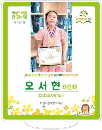 83호의 주인공 오서현 어린이는 책을 일상처럼 가까이 두고 즐기며 긴 여정을 성실히 걸어 1,000권 완독이라는 멋진 성취를 이루어냈다. 효양도서관은 이를 축하하며 인증서와 메달을 전달하고 아이의 노력과 가족의 따뜻한 응원에 박수를 보냈다.