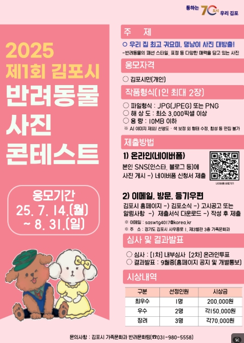 응모기간은 7월 14일부터 8월 31일까지이며, 김포시민 누구나 참여할 수 있다. 응모주제는 ‘우리 집 최고 귀요미, 댕냥이 사진 대방출!’로, 반려동물의 패션, 표정, 포즈 등 다양한 매력을 담은 사진을 제출하면 된다. 사진은 제이피지(JPG) 또는 피엔지(PNG) 형식의 파일로 1인당 최대 2장까지 제출 가능하다.