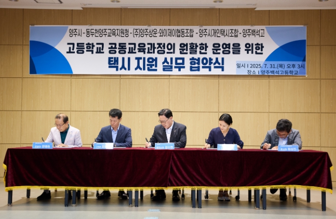 시는 31일 양주백석고등학교에서 ‘고등학교 공동교육과정 운영 택시 지원 업무협약’을 체결했다. 이날 협약식에는 양주시와 동두천양주교육지원청, 양주백석고등학교, ㈜양주상운·와이제이협동조합, 양주시개인택시조합 등 5개 기관이 참여했다.