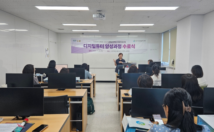 훈련생들은 지난 5월부터 총 204시간 동안 ▲컴퓨터 및 디지털 기기 활용 ▲교육정보기술 플랫폼 사용법 ▲디지털 콘텐츠 제작 ▲인공지능 도구 활용 등 실무 중심의 교육을 이수하며, 디지털 교육 현장에 즉시 투입 가능한 역량을 갖추게 됐다. 특히 수료생들에게는 한국강사교육진흥원에서 발급하는 ‘인공지능(AI) 디지털 교육 전문가 1급’ 자격증 취득 기회가 제공되어, 전문 강사로서의 역량은 물론 공신력 있는 자격을 함께 갖추는 성과를 거두었다.