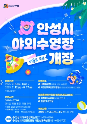 안성시 관계자는 “올해는 운영 장소를 분산하고 야간 개장을 도입함으로써 시민 편의성이 한층 향상될 것으로 기대된다.”며 “시민들이 안전하고 시원한 여름을 보낼 수 있도록 수영장 운영에 철저를 기하겠다”고 밝혔다.
