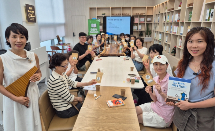 이번 강좌는 커피 전문가 홍경미 휴먼북과 팬플룻 연주자 유영미 휴먼북이 협업한 프로그램이다. 커피에 대한 이론과 이해를 바탕으로 핸드드립 실습을 진행한 뒤, 팬플룻 연주를 접목시킨 복합 문화강좌로 구성됐다.
