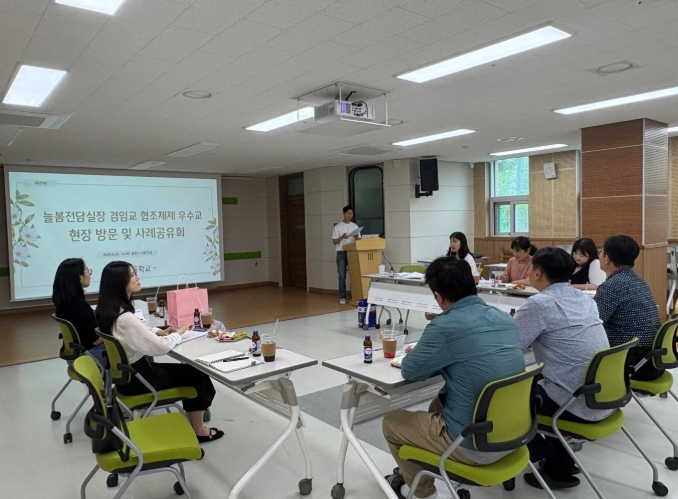 율빛초등학교 교감은 교감 및 교사로부터 늘봄 업무가 분리되기까지 늘봄학교 운영이 어떻게 전개되고 안착되어 왔는지 자신의 경험과 사례를 공유하고, 늘봄전담실장과 함께 늘봄학교 현장의 어려움과 개선 방안, 각 겸임교마다의 특성을 반영한 늘봄학교 운영에 대해 질의응답하는 시간을 가졌다.