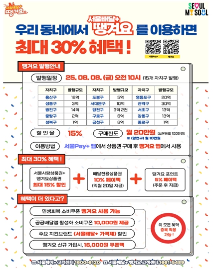서울시는 공공배달 서비스 ‘서울배달+땡겨요’를 통해 소비자와 가맹점주 모두가 체감할 수 있는 혜택을 대폭 강화한다고 밝혔다. 8일부터 15개 자치구에서 총 143억 원 규모의 ‘배달전용상품권’을 15% 할인된 가격으로 추가 발행하고, 결제 시 ‘10% 페이백’과 ‘5% 땡겨요 포인트 적립’까지 최대 30%에 달하는 할인 효과를 누릴 수 있다.
