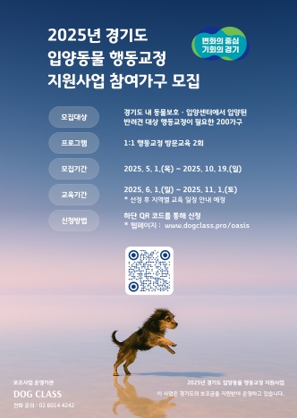 사업 참여신청은 오는 10월 19일까지이며, 홍보물의 QR코드 또는 홈페이지에 접속해 신청서를 제출하면 된다. 단, 도내 동물보호·입양센터에서 입양된 반려견일 경우만 사업에 참여할 수 있으며 동물 등록이 되어 있어야 한다. 교육은 보호자의 이해도와 반려견의 상태에 따라 맞춤형 커리큘럼으로 구성된다.