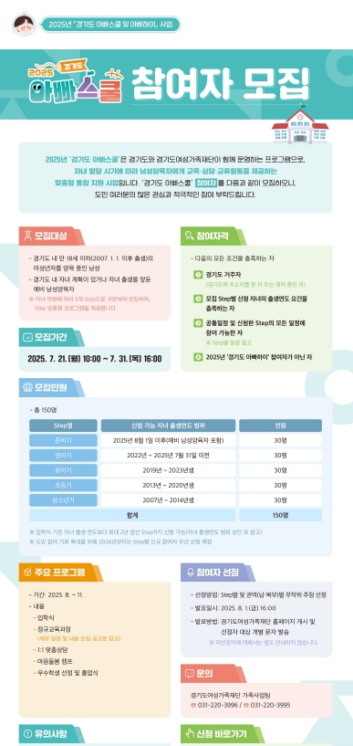 한편 재단은 새롭게 추진하는 아빠스쿨 외에도, 4세~7세 자녀를 둔 남성양육자를 대상으로 한 놀이․체험활동 지원사업인 ‘경기도 아빠하이’를 함께 추진해오고 있다.