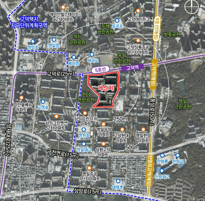 대상지는 강동구 고덕택지 지구단위계획구역 내 특별계획구역14(신동아아파트, 명일동 44번지)에 해당하며, 2025년 4월 서울시 신속통합기획 자문사업을 완료한 바 있다.