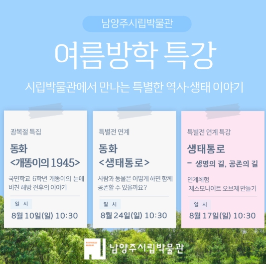 이번 특강은 무료로 운영되며, 교육 관련 세부 내용과 참가 신청은 7월 30일 오전 9시부터 남양주시립박물관 누리집에서 확인할 수 있다.
