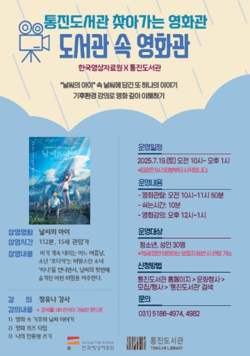 “도서관 속 영화관”에서 상영하는 ‘날씨의 아이’는 15세 관람가로 청소년 및 성인 30명을 대상으로 하나, 보호자 동반 시 15세 미만 아동도 관람이 가능하다. 또한 관내 학교 환경 관련 동아리의 단체접수도 가능하다.