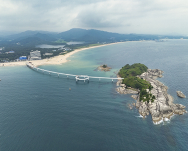 이번 사업은 죽왕면 오호리 연안 일원에 동해안의 사계절 해양레저관광 거점 시설을 조성하는 프로젝트로 사업비 484억 원(국비 205, 도비 73, 군비 206)이 투입되어 육상·해상·해중 특화시설 설치 공사가 진행 중이다.