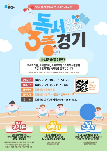 ‘독서 3종경기’는 독서 마라톤, 독서 릴레이, 독서 프로필의 세 가지 활동으로 구성된 시민 독서 챌린지로, 개인의 독서 습관 형성과 함께 읽는 독서 문화 확산을 목표로 한다. 시는 책을 매개로 한 시민 참여형 독서 문화를 정착시키고, 시민이 독서를 일상으로 받아들이는 계기를 마련하고자 한다.