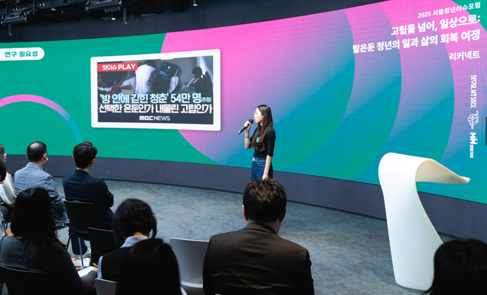 두 번째 세션에서는 청년 당사자가 직접 참여한 ‘서울청년이슈리서치’ 결과가 발표됐다. 연구는 청년 현장에서 발굴한 다섯 가지 주제를 다뤘다. △청각장애 청년의 이행기 교육 접근성 △탈은둔 청년의 회복 과정 △전세 보증금 미반환 피해 경험 △비진학 청년의 노동시장 진입 △스타트업 재직 청년의 경력관리와 조직 경험 등이 주요 내용이다.