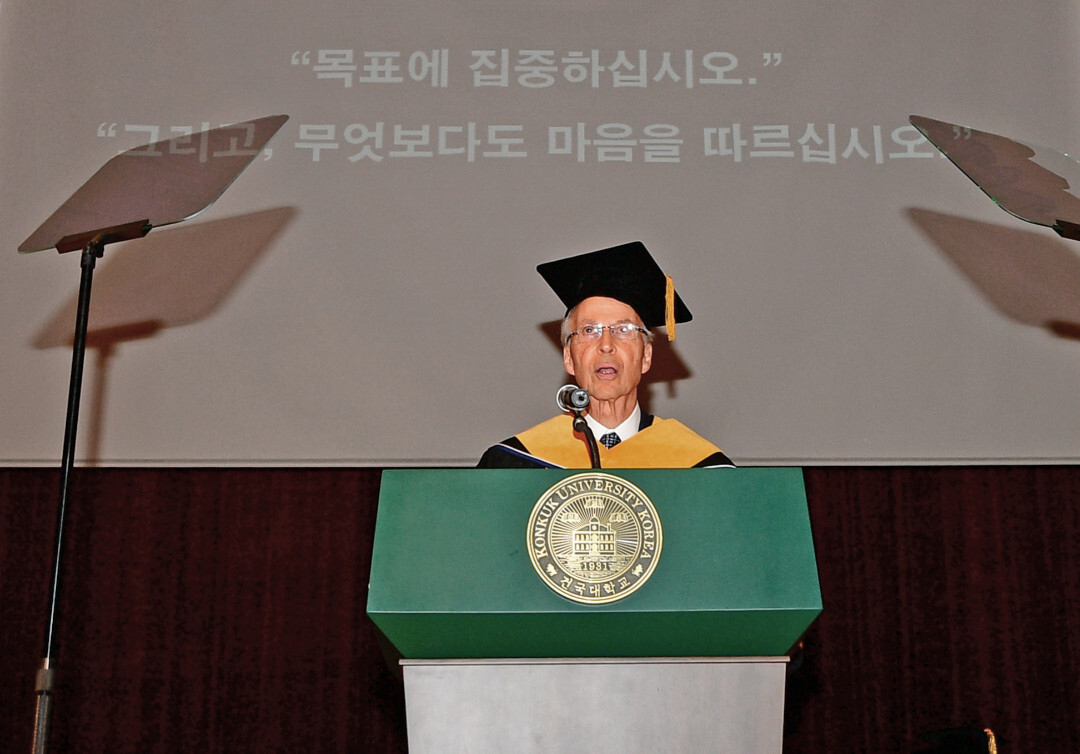 노벨 화학상을 받은 스탠퍼드대 로저 콘버그 교수가 건국대학교 ‘2025학년도 후기 학위수여식’에서 축사를 맡아 졸업생들에게 깊은 울림을 남겼다.