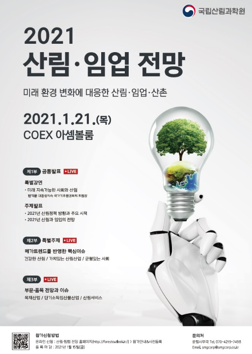 올해 산림·임업 전망대회는 온·오프라인으로 동시에 진행되며, 온라인은 공식 홈페이지 또는 국립산림과학원 공식블로그를 통하여 시청 가능한 유튜브 채널로 접근할 수 있다.