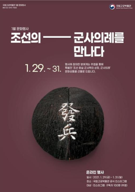 방법은 29일 인스타그램에 게시되는 ‘조선왕실 군사의례에 대한 퀴즈’를 풀고 31일까지 댓글로 답을 적으면 되고, 박물관은 정답자 중 100명을 추첨해 ‘조선왕실 군사력의 상징, 군사의례’ 전시 기념 문화상품(가방 35명, 가방장식 35명, 전시용 도록 30명)을 우편으로 증정한다. 행사에 대한 자세한 사항은 국립고궁박물관 누리집과 공식 인스타그램에서 확인하거나 전화로 문의하면 된다.