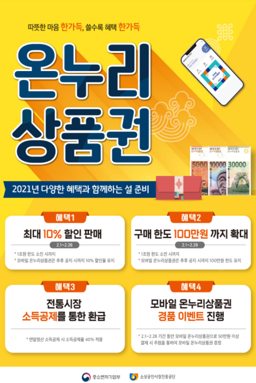 - 2.1.~2.28. 기간 동안 모바일 온누리상품권으로 50만원 이상 결제 시 추첨을 통하여 모바일 온누리상품권 증정