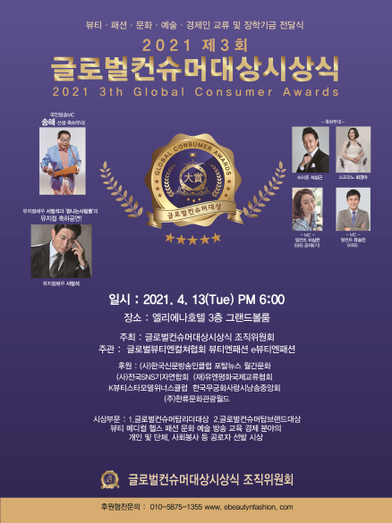 글로벌컨슈머대상시상식은 올해 3회째로 글로벌컨슈머대상시상식 조직위원회(공동조직위원장 우덕수.김태후)가 주최하고 글로벌뷰티엔컬쳐협회,뷰티엔패션, e뷰티엔패션 공동주관으로 열린다.