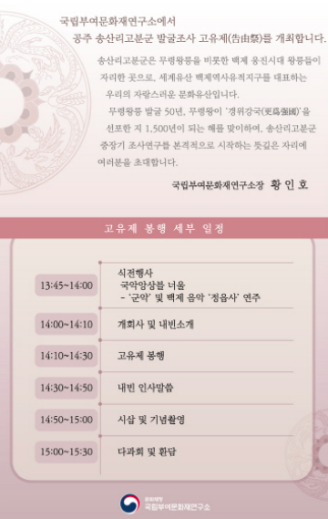 한편, 이번 고유제는 백제왕과 지역주민에게 발굴조사의 시작을 알리고, 조사단의 안전을 기원하기 위한 행사다. 행사는 국악앙상블 너울의 정읍사 공연을 시작으로, 국립부여문화재연구소의 송산리 고분군 조사의 경과 보고, 공주시 유림회 집례(集禮)에 따른 고유제 봉행, 내·외빈 인사말씀, 시삽, 기념촬영 순서로 진행된다. 코로나19 확산 방지를 위하여 100명 내 관계자 중심으로 참석인원을 제한하여 개최한다.