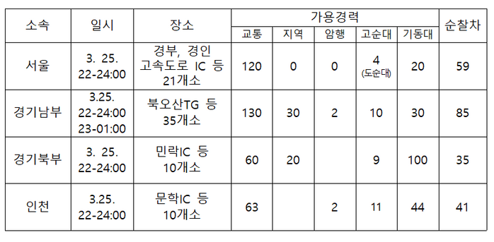이번 일제 단속은 수도권 고속도로 나들목 출구 등 76개소에서 교통경찰, 지역경찰, 고속도로순찰대, 기동대 등 가용경력 655명, 순찰차 220대를 총동원하여 오는 25일 심야에 실시할 예정이다.