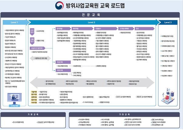 방위사업교육원은 기존 청 직원 중심 교육에서 군인, 방산업체까지 교육 대상을 확대하여, 교육과정을 사업관리 중심 / 수준별 맞춤형으로 3단계로 구분하여 전면 개편하였다.