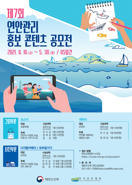 올해 공모전은 연안의 다양한 모습을 초등학생의 시선에서 그림으로 표현하는 ‘포스터 그리기’와 전 국민 누구나 참여할 수 있는 ‘바다 사진’ 및 ‘캐릭터 그리기’ 등 총 3개 부문으로 나누어 진행된다.