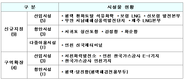 신규 지정 시설은 수소연료, 풍력발전 등 신기술을 사용하는 산업시설 5개소, 강정항 등 항만시설 3개소, 다중이용시설인 인천신국제터미널 1개소 등이다.