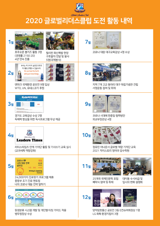 이처럼 글로벌 리더스 어학원의 3가지의 역량 교육은 성공적인 결과도 도출해냈다. 2017년도에는 50명 원생이 국제 봉사증을 취득하고 120개국이 참가한 국제봉사대회 우수상, 대구 자원봉사대회 우수상 및 교육감 상을 수상하였다. 2018년도에는, 아프리카 신생아 살리기에 동참하여 20명의 원생이 모자 뜨기에 동참하고, 약사를 꿈꾸는 학생들이 꿈 발굴단 체험에 나섰다.
