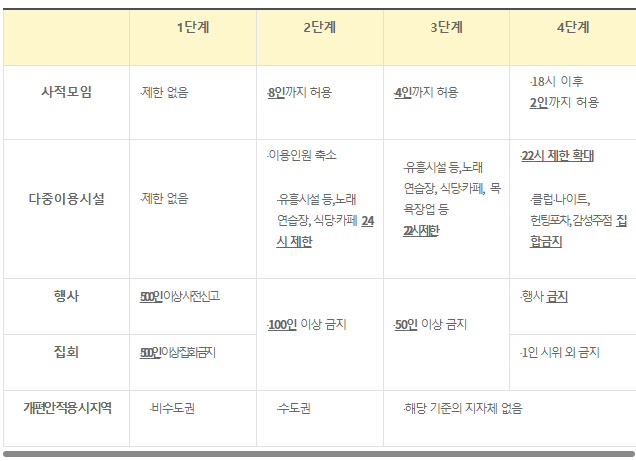 시설에 대해서는 단계별 위험도에 따라 차등적으로 운영시간을 제한하고, 집합금지는 4단계(전국 2천 명 이상)의 클럽(나이트 포함), 헌팅포차, 감성주점에만 적용된다.