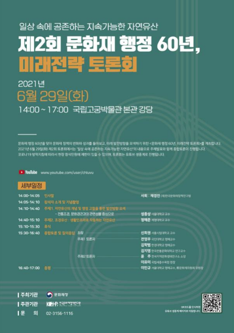 지난 5월에 이어 두 번째로 열리는 이번 토론회에서는 ‘일상 속에 공존하는 지속가능한 자연유산’이라는 주제 아래, 문화재의 한 축인 자연유산의 외연을 확대하기 위한 방안과 자연유산을 매개로 국민의 경제·사회적 가치를 증진시키기 위한 중장기 전략을 논의할 예정이다.