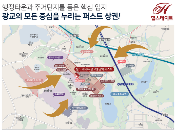 자세히 들여다보면, 먼저 입지조건으로 광교신도시는 2022년 특레시로 거듭나는 수원시, 용인시 경계에 위치해 있으며, 앞서 말한 경기남부의 행정중심지로서의 입지를 최적화 시킬 경기융합타운이 조성된다. 이에 따른 ‘광교중앙역 힐스에비뉴 퍼스트’가 경기융합타운 내 마지막 주상복합 부지라는 점을 위시한 시너지 효과가 극대화 될 것이라는 전문가들의 분석이 지배적이다.