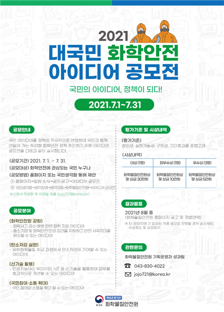 한편, 화학물질안전원은 지난해 '2020 대국민 아이디어 공모전'에 제출된 아이디어 중 '화학사고 조사 및 보고 개선', '무인기(드론)를 통한 공단지역 환경감시' 등을 업무에 반영하여 추진하고 있다.