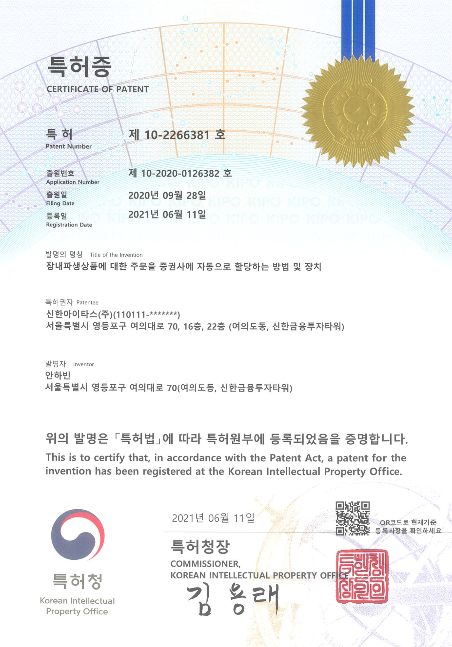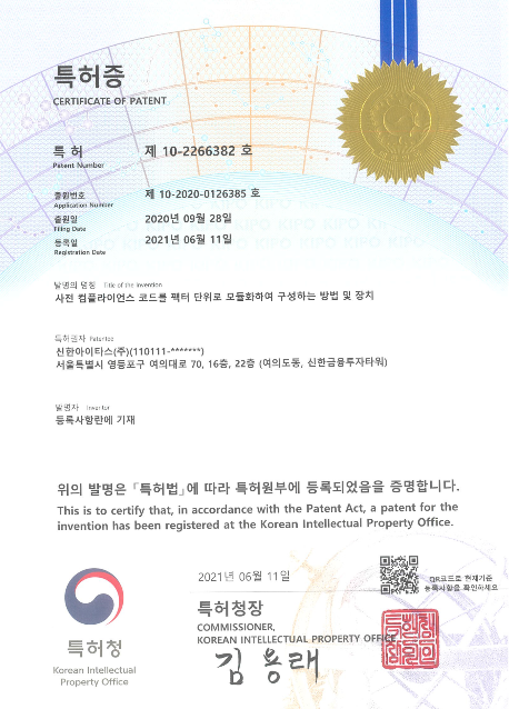 신한아이타스는 자산운용 과정의 오류를 사전 예방하는 이번 특허로 경쟁 서비스 업체들과 초격차를 벌이게 됐다. 제 10호 특허권 ‘사전 컴플라이언스 코드를 팩터 단위로 모듈화하여 구성하는 방법 및 장치’는 주문 시, 법규 및 가이드라인 위반을 사전 체크하는 컴플라이언스를 강화한다. 제 11호 특허권 ‘장내파생상품에 대한 주문을 증권사에 자동으로 할당하는 방법 및 장치’는 장내 파생상품의 직접 주문과 주문 생성시 증권사 지정 및 배정을 자동으로 처리하여 주문오류를 사전 예방한다.