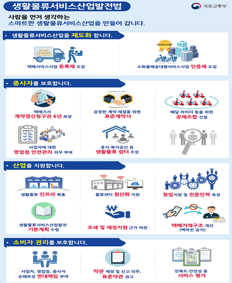 별도 법률이 제정‧시행됨에 따라, 전자 상거래 활성화, 코로나로 인한 비대면 소비가 증가로 우리 삶에 보편서비스로 자리 잡은 생활물류산업에 대한 정부 지원이 본격화 될 전망이다