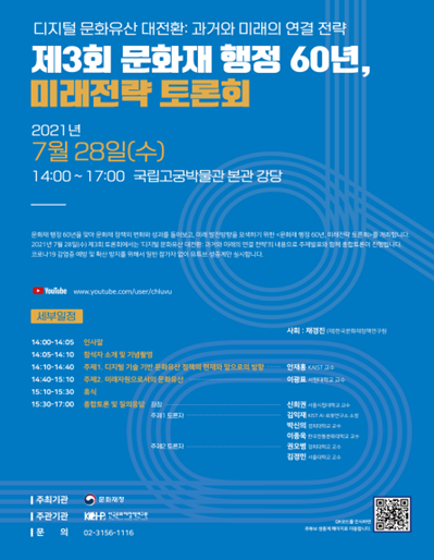 지난 5월과 6월에 이어 세 번째로 열리는 이번 토론회에서는 ‘디지털 문화유산 대전환, 과거와 미래의 연결전략’이라는 주제 아래, 코로나19 이후 디지털 대전환 시대라는 사회적 변화에 대응하여 디지털을 기반으로 한 문화유산의 보존과 활용 정책을 논의해 새로운 미래 가치를 창출하는 방안을 모색하게 된다.