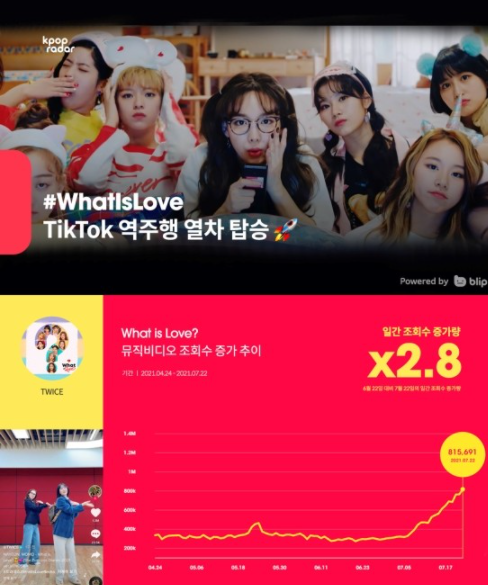지난 22일 케이팝 레이더에 집계된 ‘What is Love?’ 뮤직비디오 일간 조회수는 약 81만 뷰를 기록해, 90일 중 최고 증가량을 기록했다.