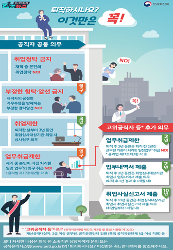 또한, 모든 공직유관단체 임직원은 재직 중에 직접 담당했던 재정보조, 인·허가, 검사·감사, 조세부과, 계약, 감독, 사건수사 등 일정 업무에 대해 퇴직 이후 취급이 제한된다.