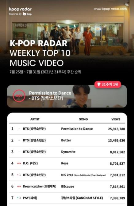 방탄소년단의 8번째 디지털 싱글인 ‘Permission to Dance’ 뮤직비디오는 케이팝 레이더 31주차 집계 기간 (7월 25일 ~ 7월 31일) 동안 2,591만 뷰를 기록하며, 4주 연속 1위를 차지했다.
