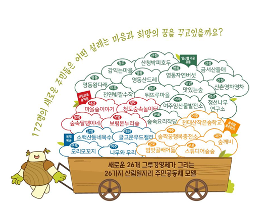 한편, ’18년 4월 산림일자리발전소 출범 이후 현재 1,910명 참여하는 227개의 주민공동체(그루경영체)가 활동하고 있으며. 약 110개는 법인화하여 지역에 특화된 산림 사업을 만들어 가고 있다.